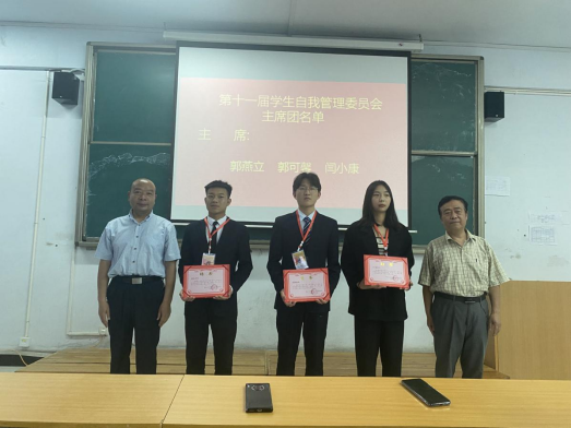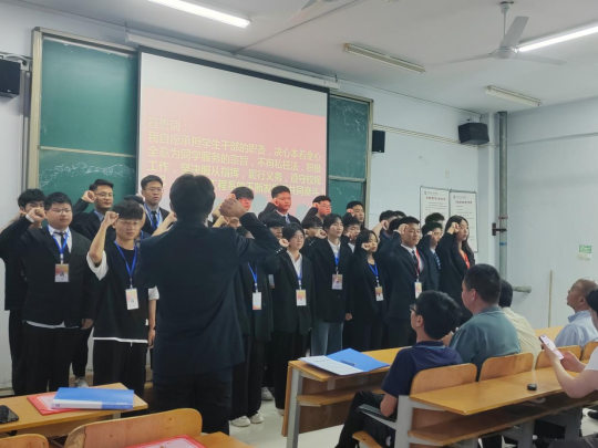 系部领导为主席团及各部门负责人颁发聘书,团总支书记程文浩宣读《关于学生自我管理委员会主席团的任命通知》,自管会会长郭燕立作为主席团代表宣读《关于学生自我管理委员会部长、副部长的任命通知》,新任自管会成员进行了入职宣誓。自此,机电工程系学生自我管理委员会换届圆满成功。