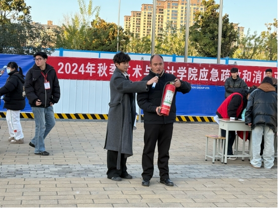 在灭火演练现场,盛明浩教员向大家详细讲解了灭火器的正确使用方法,包括如何检查灭火器是否正常、如何操作灭火器的压把、如何对准火焰根部进行喷射等。随后,部分学生和工作人员在保卫处人员的指导下,亲自体验了灭火器的使用,成功扑灭了模拟火源。