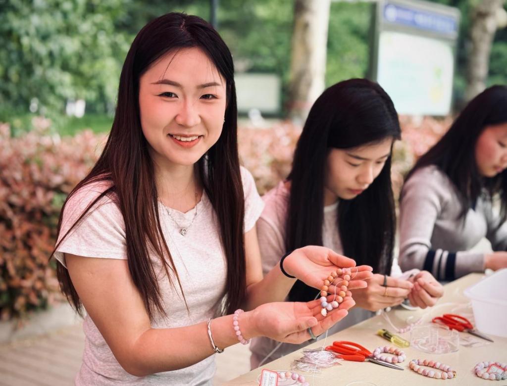 与此同时,串珠区域也是热闹非凡。串珠,作为一种精细的手工艺术,不仅能够锻炼人的耐心与细致,更能激发无限创意。参与者们通过校园非遗工坊志愿者的讲解学会了串珠技巧,如穿线、打结、搭配色彩等,纷纷动手制作出了一件件精美的作品。