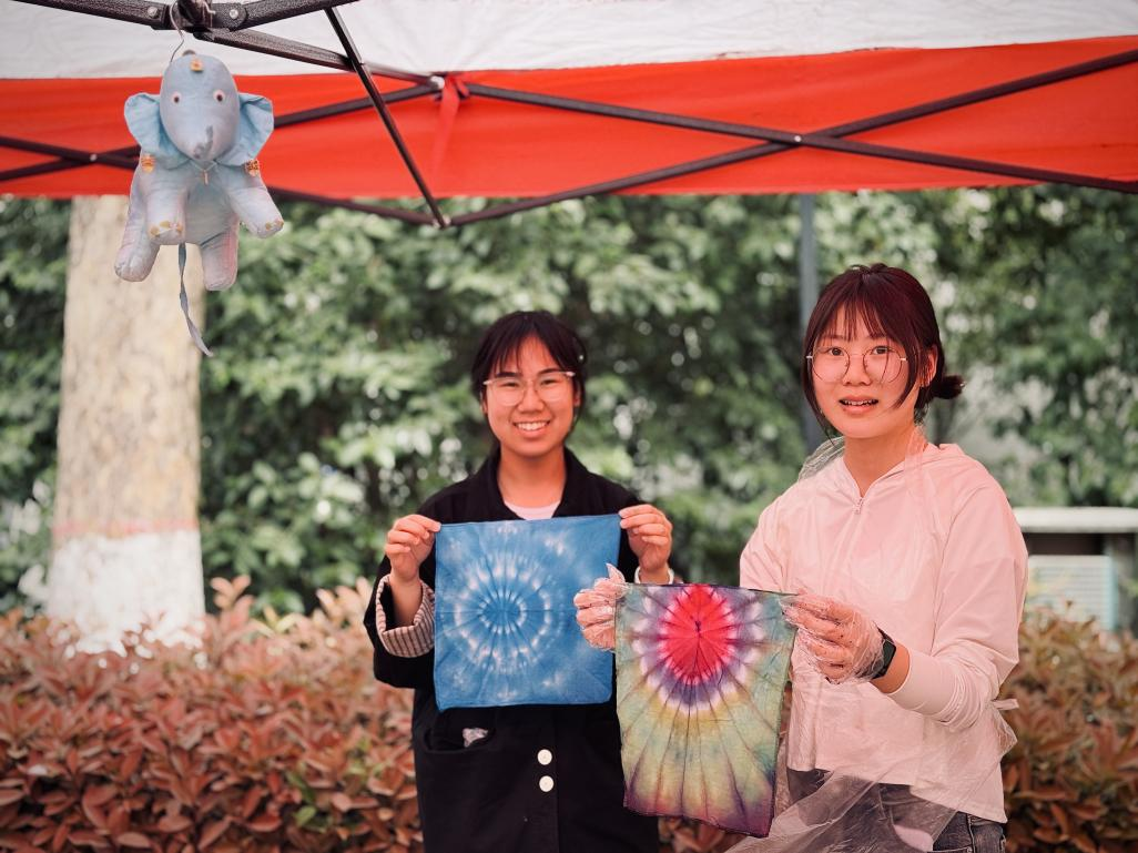 扎染,作为中国民间传统而独特的染色工艺,以其丰富的图案变化和自然过渡的色彩著称。学生们通过折叠、捆扎、浸染等步骤,制作出一件件独一无二的扎染作品,从方巾到帽子和玩偶,每一件作品都承载着参与者对美的追求和对传统文化的致敬。