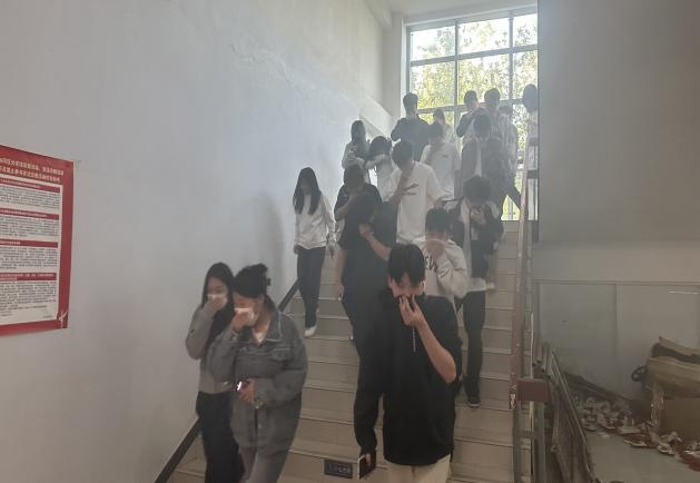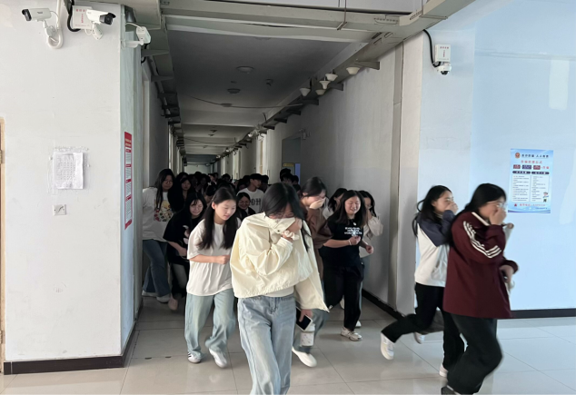 演练开始,警报声骤然响起,烟雾四起,同学们迅速起身跑向安全出口。他们用手捂住口鼻,弯腰低姿前行,按照预定的疏散路线,紧张有序地撤离到安全区域。现场志愿者在各个关键位置沉着指挥,确保每位同学都能安全到达室外空旷地点。整个疏散过程有条不紊,充分展现了同学们良好的应急反应能力。