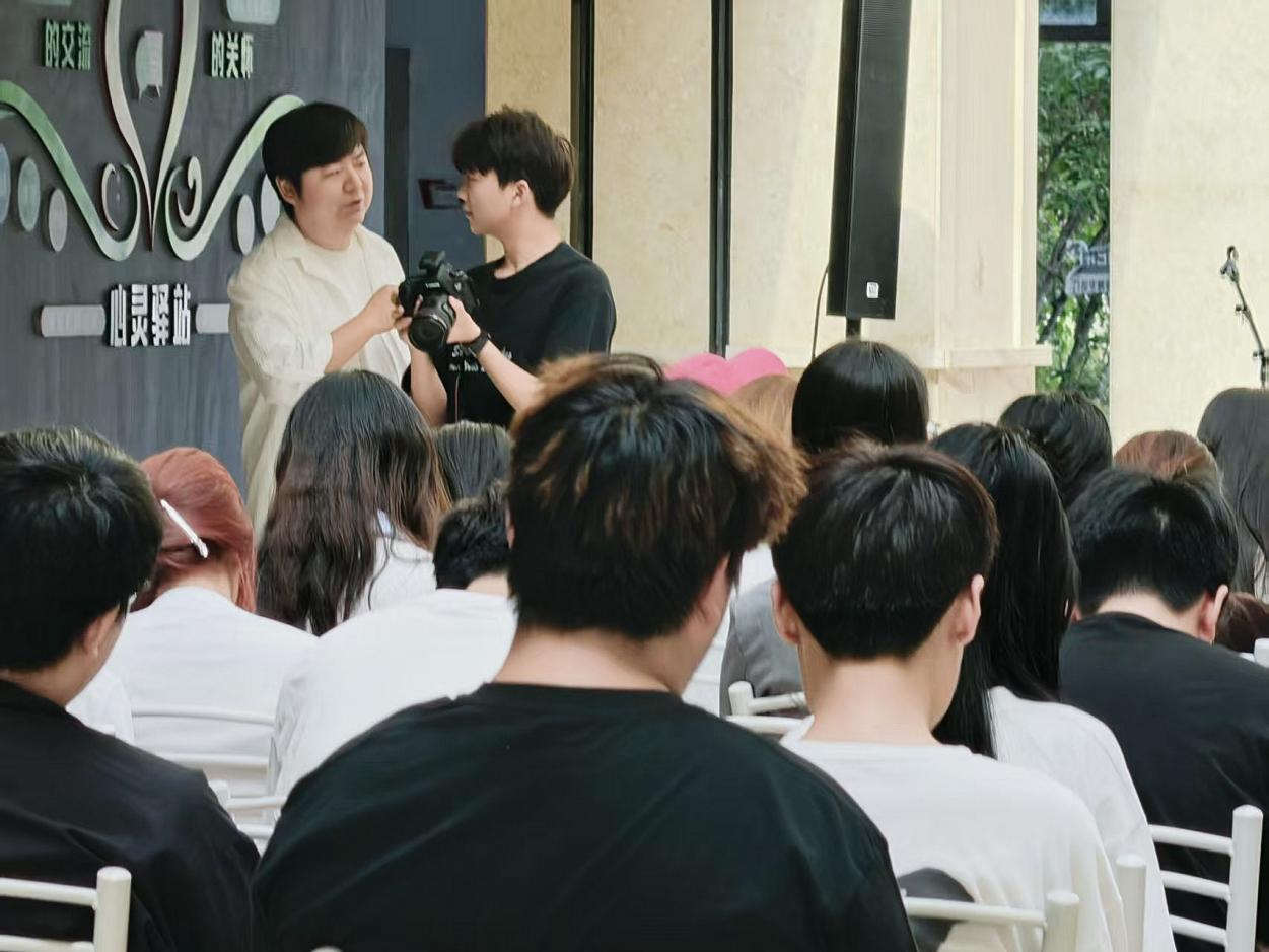 本次摄影实践课程呈现三大亮点:1)企业导师驻场:传媒公司技术总监携带专业设备演示商业活动拍摄流程及实战技能,指导学生们灵活运用构图法则、光线调节等知识点,动态抓拍读者专注神态,掌握"决定性瞬间"捕捉技巧,通过多场景拍摄对比,理解不同光线环境下的参数调整逻辑;2)实景分级任务:设置"主视觉拍摄""读者特写""活动花絮"等不同难度任务组,培养技能的同时提升团队协作与创意表达能力;3) 即时作品点评:拍摄完成后“双导师”即时以行业标准对学生作品进行专业分析并提改进建议。
