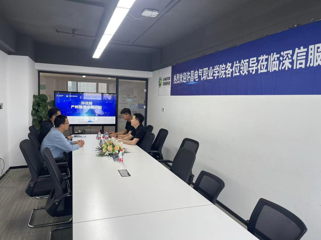 双选会结束后,学院一行前往深信服科技河南办事处开展调研。深信服科技负责人系统介绍了公司在信息安全领域的产业布局及教育行业解决方案,重点展示了面向高校的网络安全人才培养课程体系、实训平台及认证机制。李禄源副院长结合学院专业设置,提出"课程共建、师资共享、实习就业联动"的合作构想,双方围绕校企联合开发实践课程、共建产业学院、开展"订单式"人才培养等议题展开探讨。